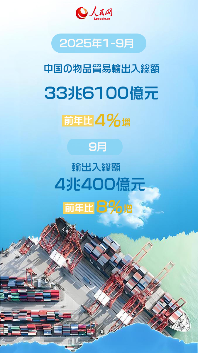 また、9月単月の輸出入総額は同8%増の4兆400億元で、前月より4.5ポイント上昇し、今年に入って月間最高を記録した。