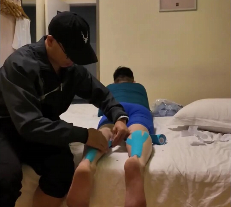 マラソン大会開始前に、ランナーの足をマッサージする伴走者(写真提供・銭江晩報)。