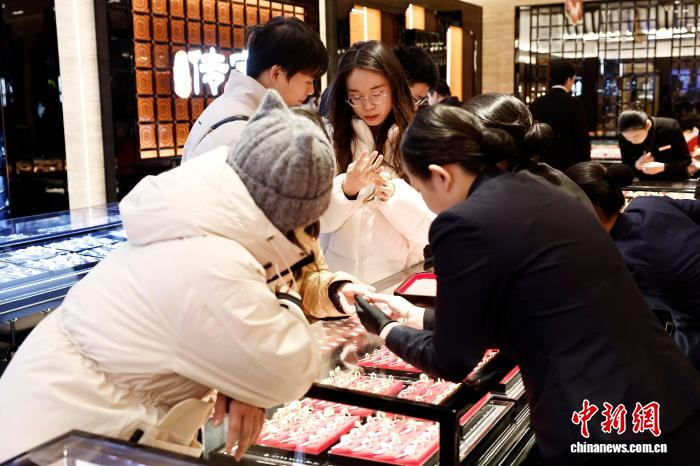 上海市南京路歩行者天国の店舗で、ゴールドジュエリーを選ぶ市民(2025年12月31日撮影・殷立勤)。