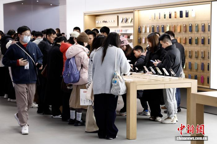 上海市南京路歩行者天国の店舗で、スマートフォンを選ぶ市民(2025年12月31日撮影・殷立勤)。