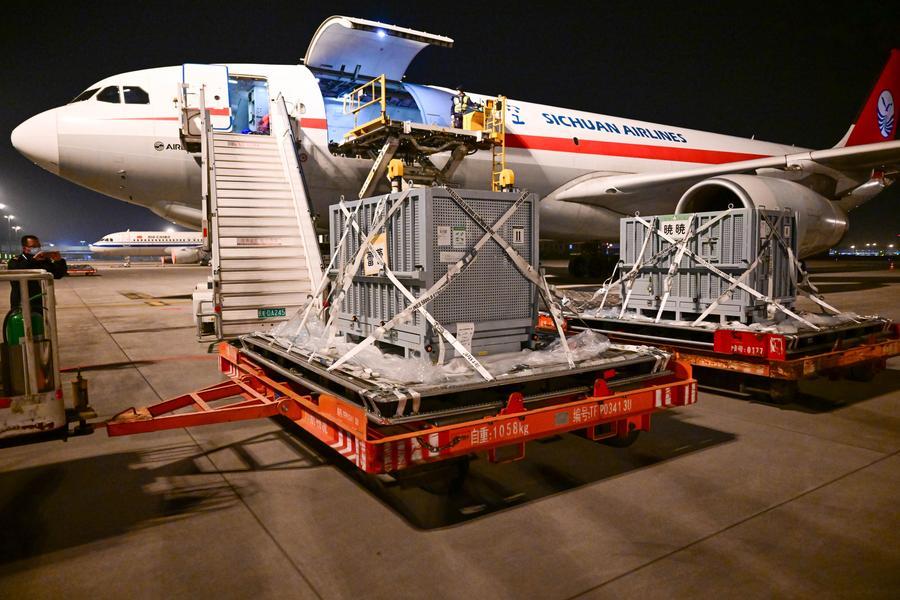 28日、成都天府国際空港に到着したシャオシャオとレイレイ。(成都=新華社配信)