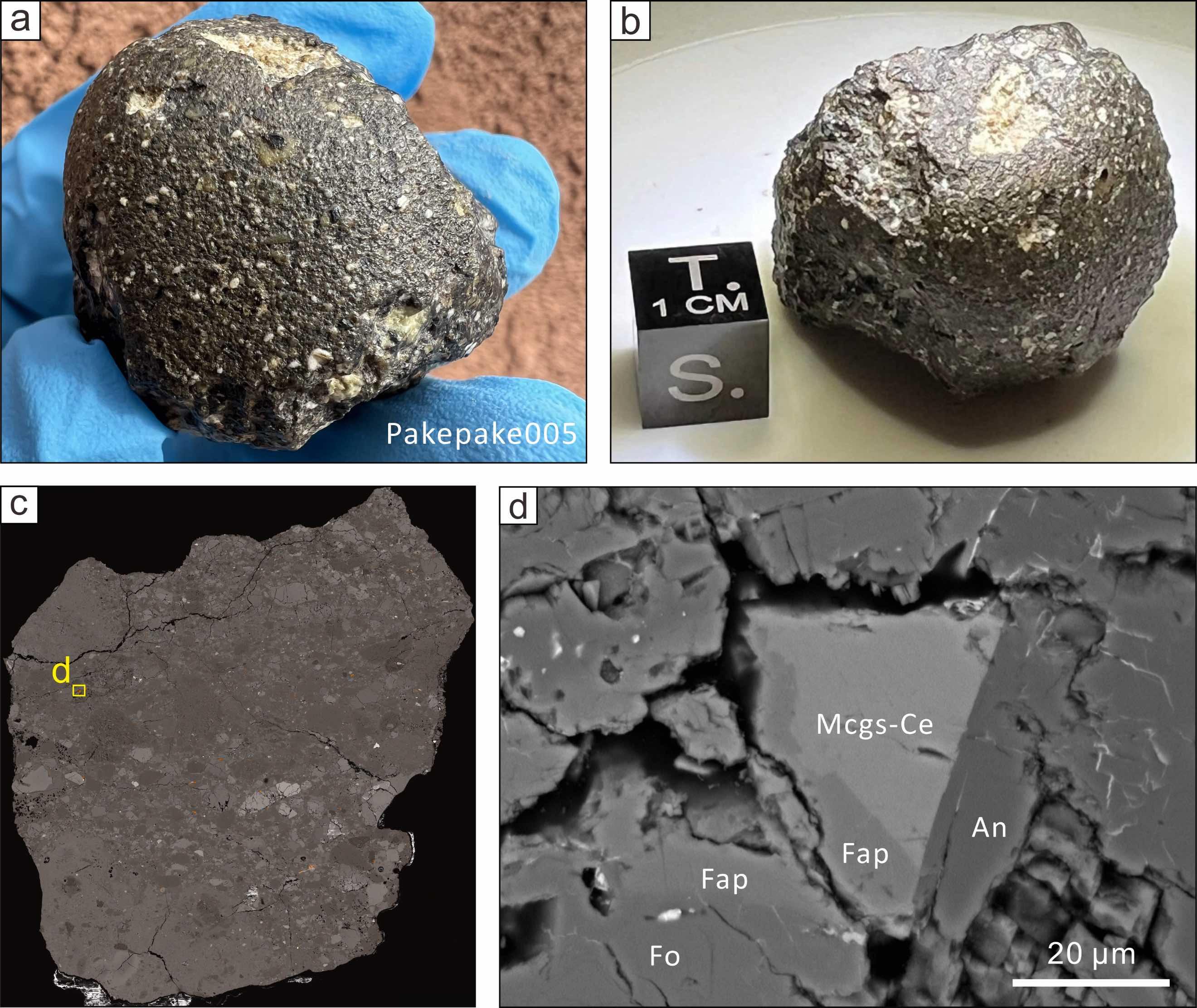 a-b:月隕石「Pakepake005」、c:月隕石「Pakepake005」の薄片の電子顕微鏡写真、d:セリウム・マグネシウム嫦娥石とその共生鉱物(写真提供・中国地質調査局)。