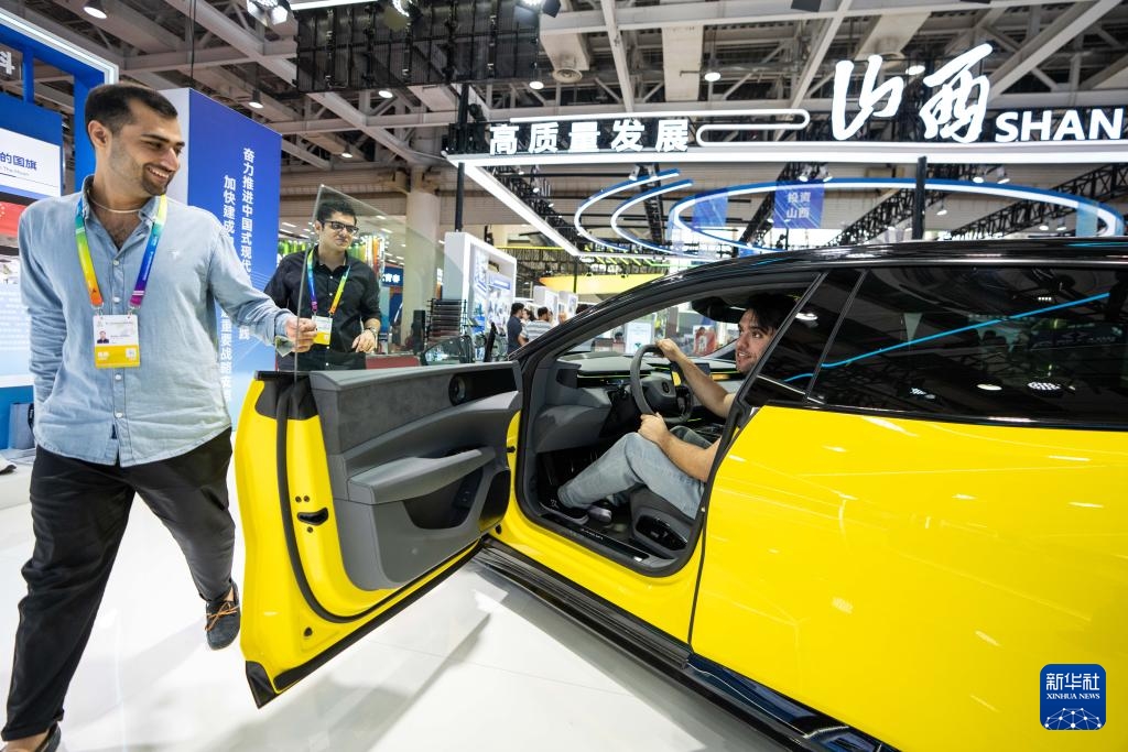 5月31日、中国中部投資貿易博覧会で、展示された乗用車に試乗する人。(長沙=新華社記者/陳思汗)