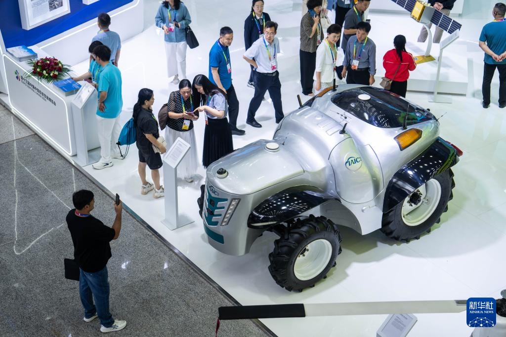 5月31日、中国中部投資貿易博覧会で、5G技術を使った水素エネルギー自動操縦トラクターを見る人たち。(長沙=新華社記者/陳思汗)