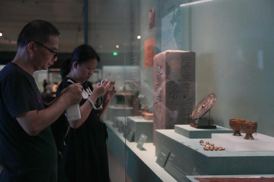 4日、長沙博物館「不尽長江滾滾来-長江と中華文明」特別展で展示を見る人たち。(長沙=新華社記者/薛宇舸)