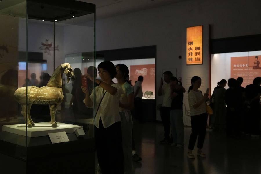 4日、長沙博物館「西北風来塞柳長青-甘粛魏晋画像磚」特別展で、展示を見る人たち。(長沙=新華社記者/薛宇舸)