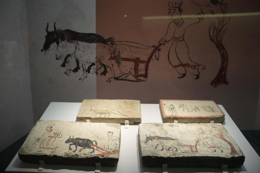 4日、長沙博物館「西北風来塞柳長青-甘粛魏晋画像磚(せん)」特別展に展示された農業を描いた画像磚。(長沙=新華社記者/薛宇舸)
