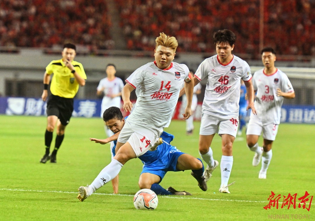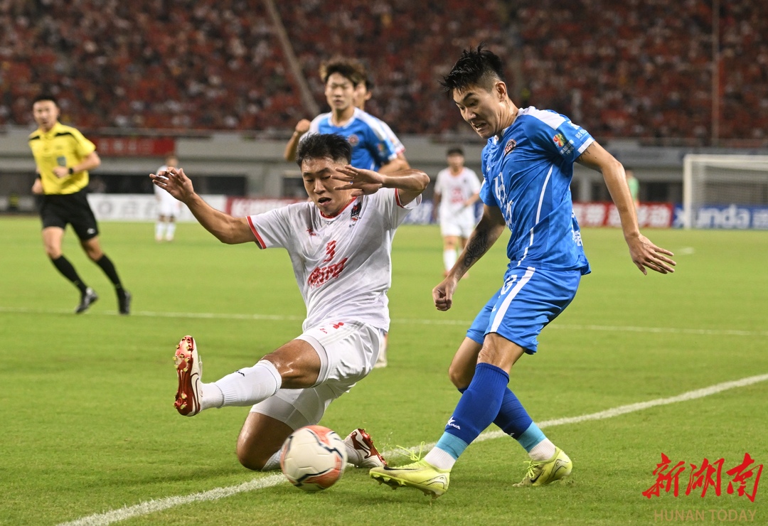 10月10日夜、長沙チーム(青)と衡陽チームの選手たちは試合中、激しくボールを奪い合った。この日、湘超リーグ第5ラウンドの試合が行われ、長沙賀龍体育場で長沙チームが衡陽チームと対戦した。結果、長沙チームが2対0で衡陽チームを下した。郭立亮 撮影