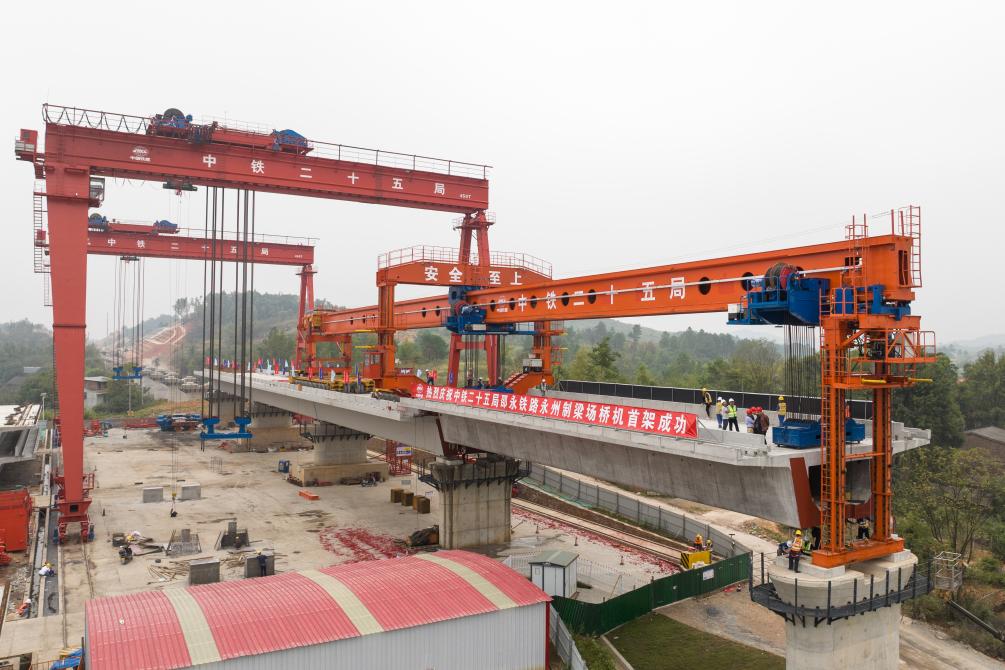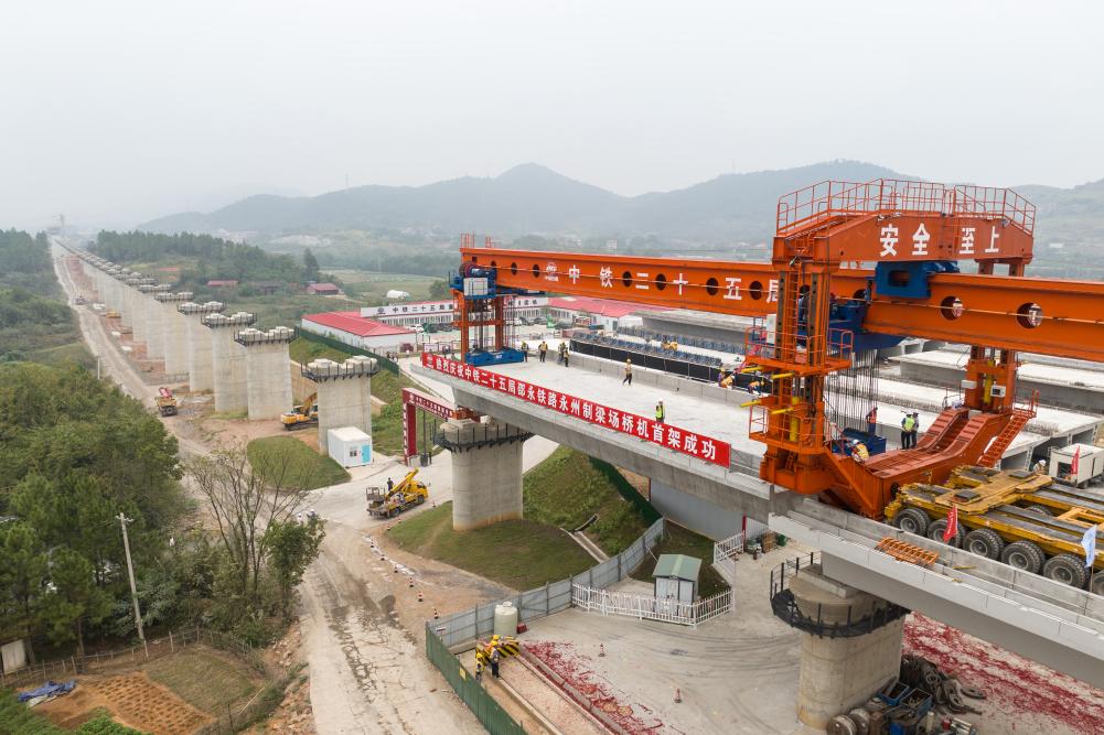 【新華社永州10月16日】中国交通インフラ建設大手、中国鉄建傘下の中鉄二十五局集団が湖南省永州市で建設を担う邵永高速鉄道(湖南省邵陽市-永州市)の芦洪江特大橋に13日、長さ32・6メートル、重さ約817トンの箱桁が設置された。第3工区の橋梁架設は順調に進んでいる。