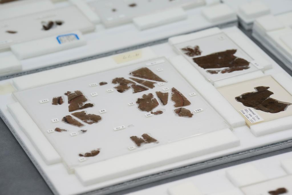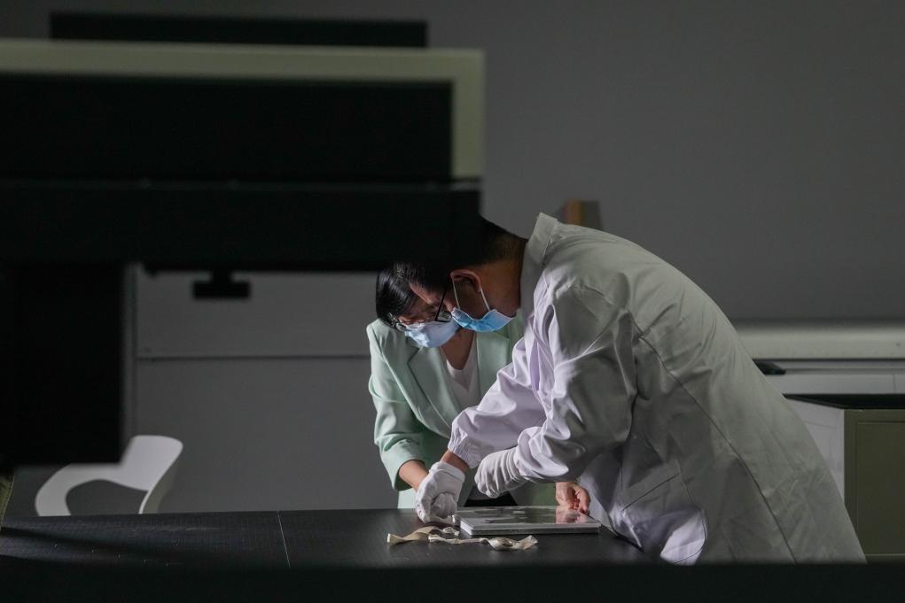 湖南省博物館の文化財保管庫で子弾庫帛書の標準化画像の収集をする職員。(9月11日撮影、長沙=新華社記者/薛宇舸)