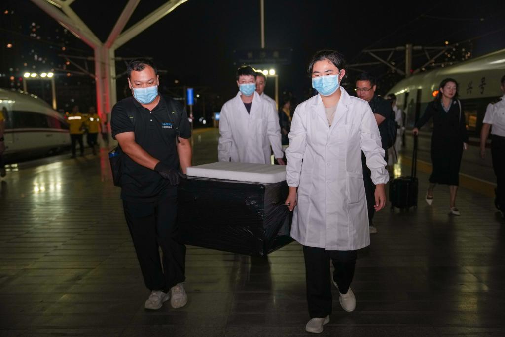 長沙南駅で北京から到着した子弾庫帛書が入った箱を運ぶ職員。(9月10日撮影、長沙=新華社記者/薛宇舸)