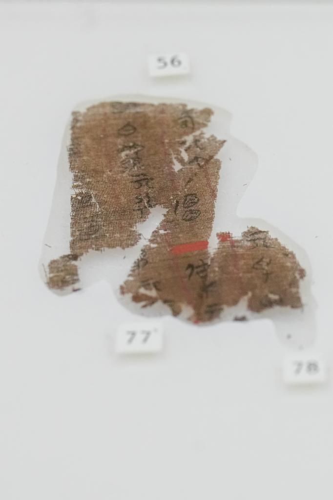 13日、湖南省博物館に展示された子弾庫帛書の一部。(長沙=新華社記者/陳振海)