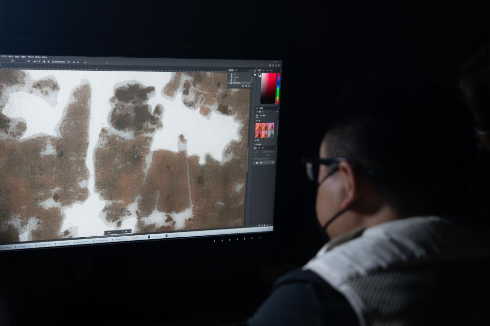 湖南省博物館の文化財保管庫で子弾庫帛書の標準化画像を確認する職員。(9月11日撮影、長沙=新華社記者/薛宇舸)