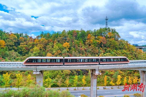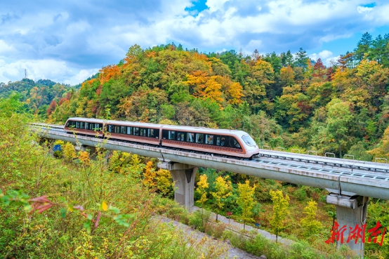 近日、鳳凰県沱江鎮齐良橋村では、観光客が鳳凰磁気浮上式観光特急線に乗り、沿線の紅葉が山に染まる秋の絶景を満喫し、「車が絵の中を走る」ような特別な体験を味わっている。梁永鴻 撮影