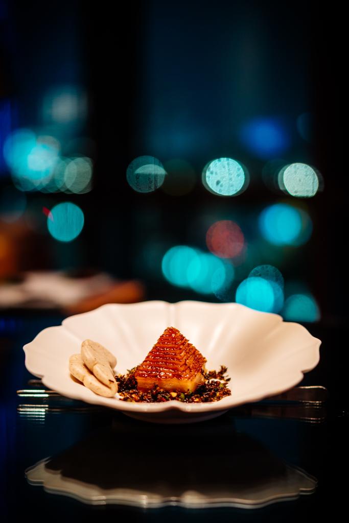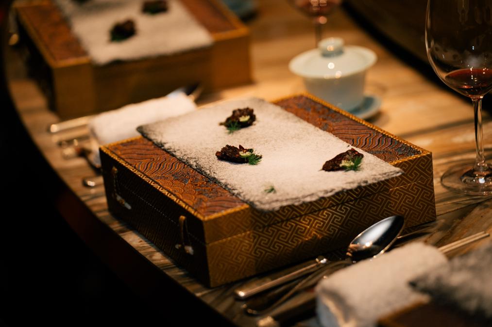 7日、前菜「雪影椒香鮑参脯(せつえいしょうこうほうじんほ)」。「立冬」の趣を「雪影」のイメージで表現し、馬王堆漢墓から出土した遣冊(けんさく=副葬品の目録)に記された燻製(くんせい)や塩漬けと組み合わせている。(長沙=新華社配信)