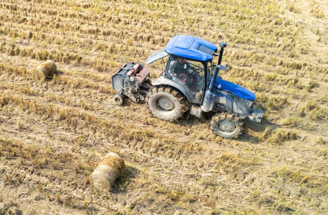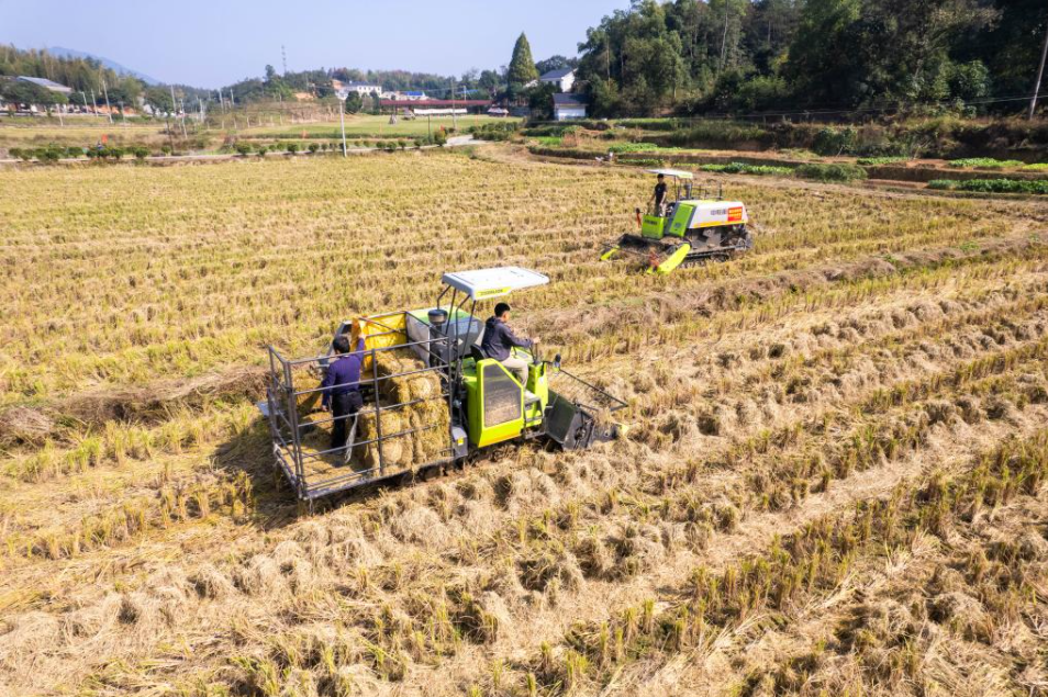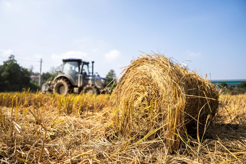 5日、長沙県開慧村で自走式結束機を運転し、稲わらを回収する村民。(長沙=新華社記者/陳思汗)