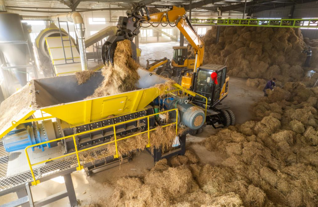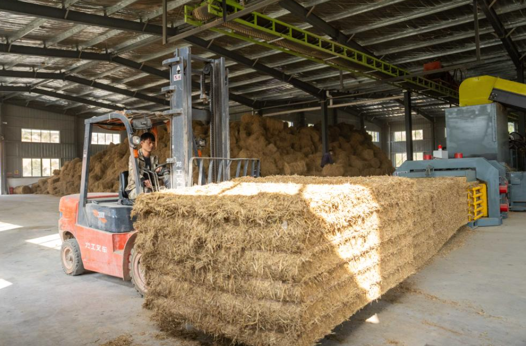 5日、長沙県開慧鎮にある加工場で、稲わらから作った飼料を運ぶ作業員。(長沙=新華社記者/陳思汗)