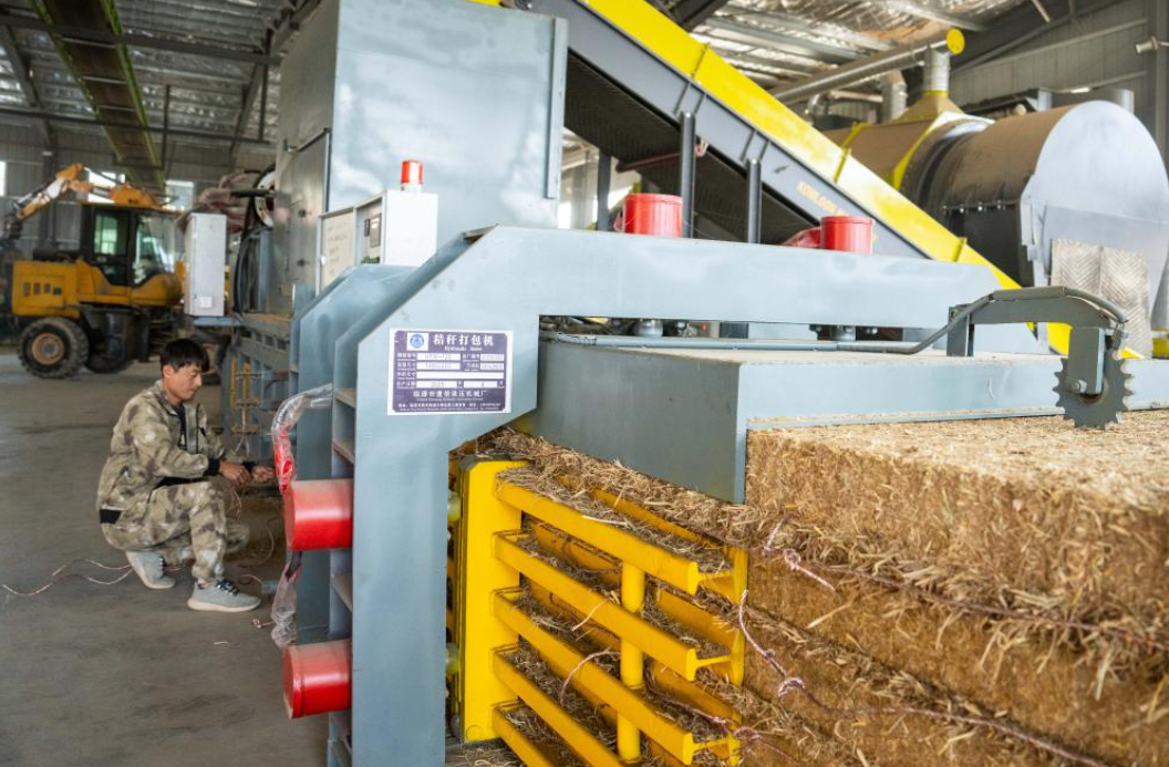 5日、長沙県開慧鎮にある飼料加工場で結束機を操作する作業員。(ドローンから、長沙=新華社記者/陳思汗)