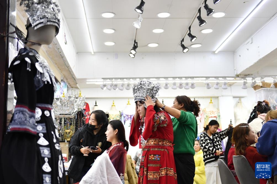 鳳凰古城の旅行写真店で衣装を着る観光客(11月6日撮影・陳振海)。