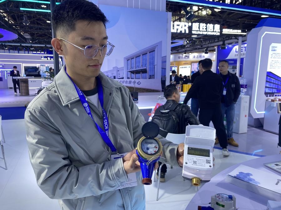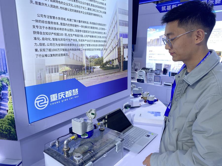 11日、超音波式水道メーターを実演する重慶智慧水務の技術者。(衡陽=新華社記者/明星)