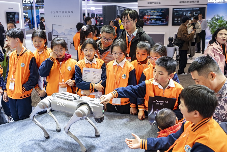 11月20日、長沙北辰国際会議センターで、来場者が2025世界計算大会のイノベーション成果展示エリアに設けられたUnitree Robotics(宇樹科技)のブースで、ロボット犬のパフォーマンスを見学した。 童臻熙 撮影 訳者:王冰菁 校閲者:瞿莎蔚 記事出処:湖南省政府中国語ポータルサイト