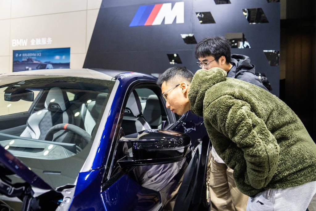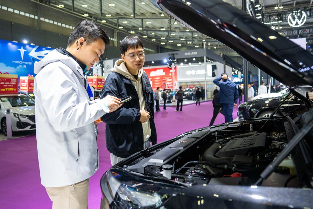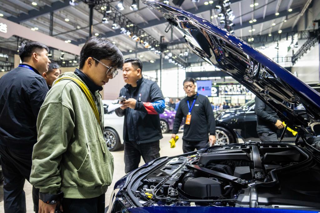 10日、第21回長沙国際モーターショーの会場で、展示車の内部構造を見る人(手前)。(長沙=新華社記者/陳思汗)