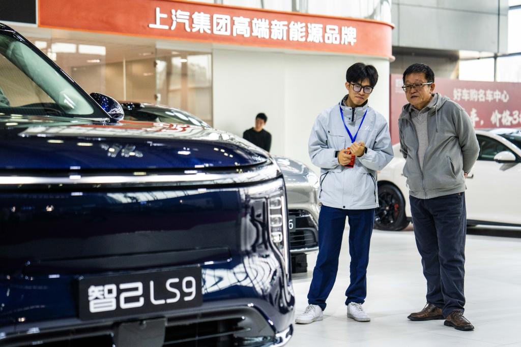 10日、第21回長沙国際モーターショーの会場で、展示車を見る人(右)。(長沙=新華社記者/陳思汗)