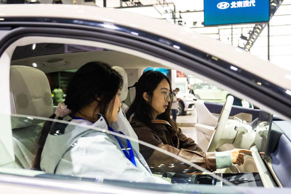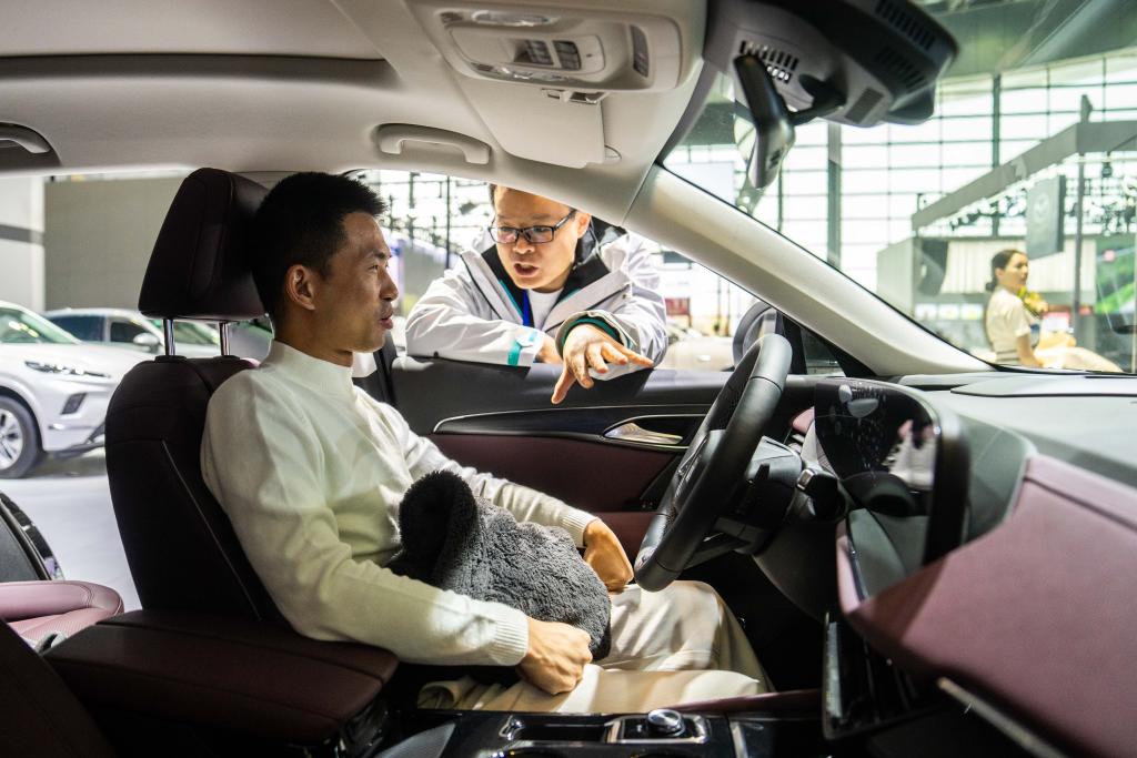 10日、第21回長沙国際モーターショーの会場で、展示車の車内を見る人。(長沙=新華社記者/陳思汗)