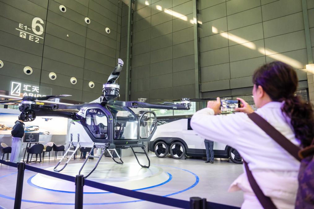 10日、第21回長沙国際モーターショーの会場で、展示された電動垂直離着陸機(eVTOL)を撮影する人。(長沙=新華社記者/陳思汗)