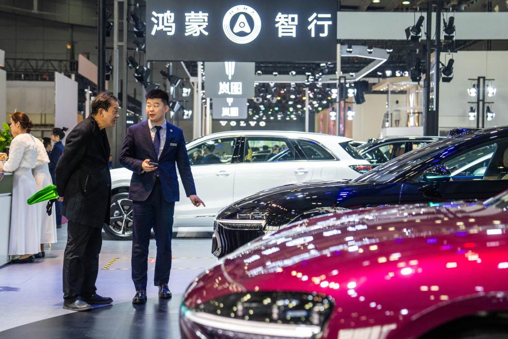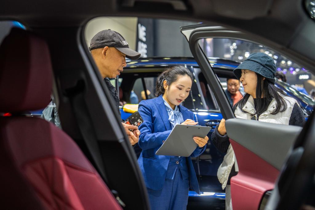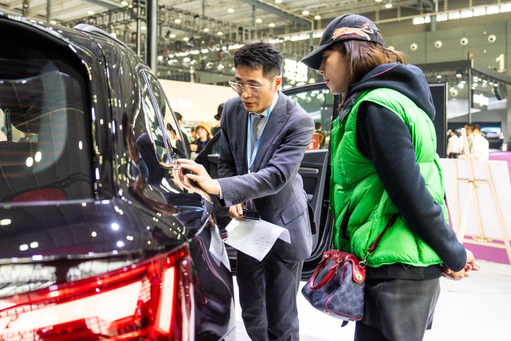 10日、第21回長沙国際モーターショーの会場で、展示車を紹介するスタッフ(中央)。(長沙=新華社記者/陳思汗)