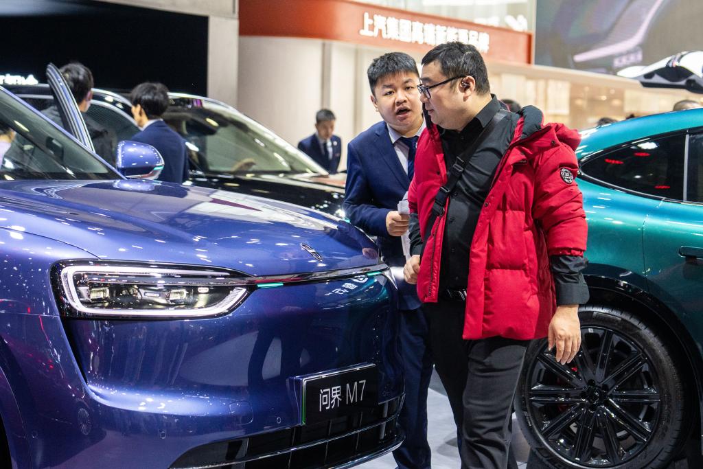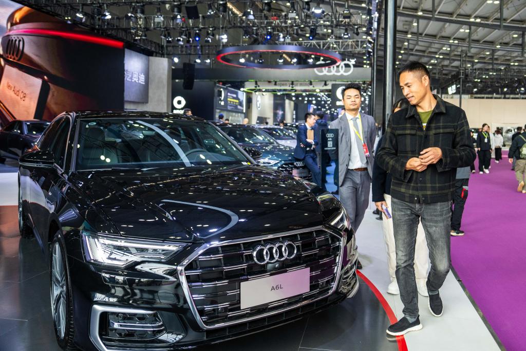 10日、第21回長沙国際モーターショーの会場で、展示車を見る人(右端)。(長沙=新華社記者/陳思汗)