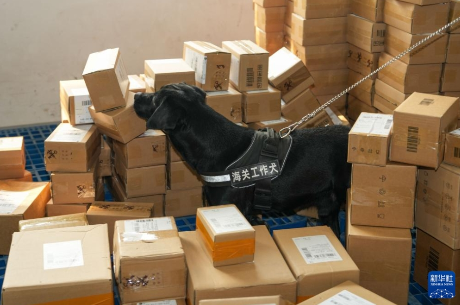 長沙国際郵便互換局で、輸入小包を検査する税関の麻薬探知犬(12月10日撮影・薛宇舸)。