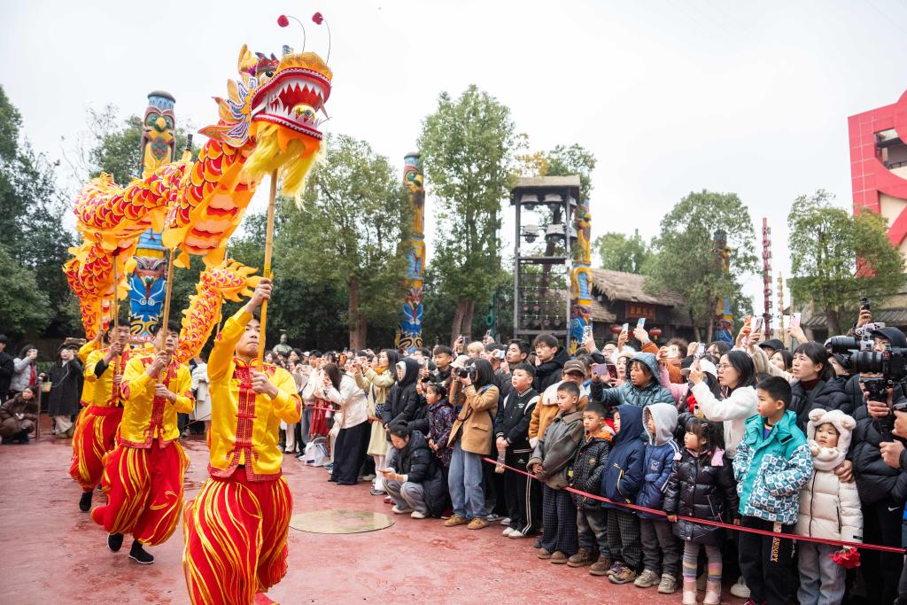 7日、寧郷市炭河古城風景区で竜舞のパフォーマンスを見物する観光客。(長沙=新華社記者/陳思汗)
