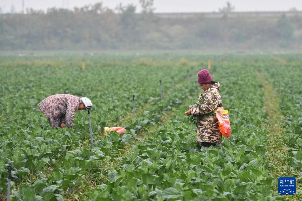 10月30日、沅江市草尾鎮楽園村の野菜畑で収穫作業を行う農家。新華社記者 陳振海撮影