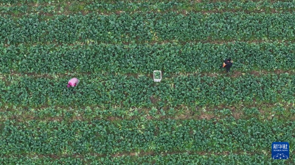10月30日、沅江市草尾鎮楽園村の野菜畑で収穫作業を行う農家(ドローン写真)。新華社記者 陳振海撮影