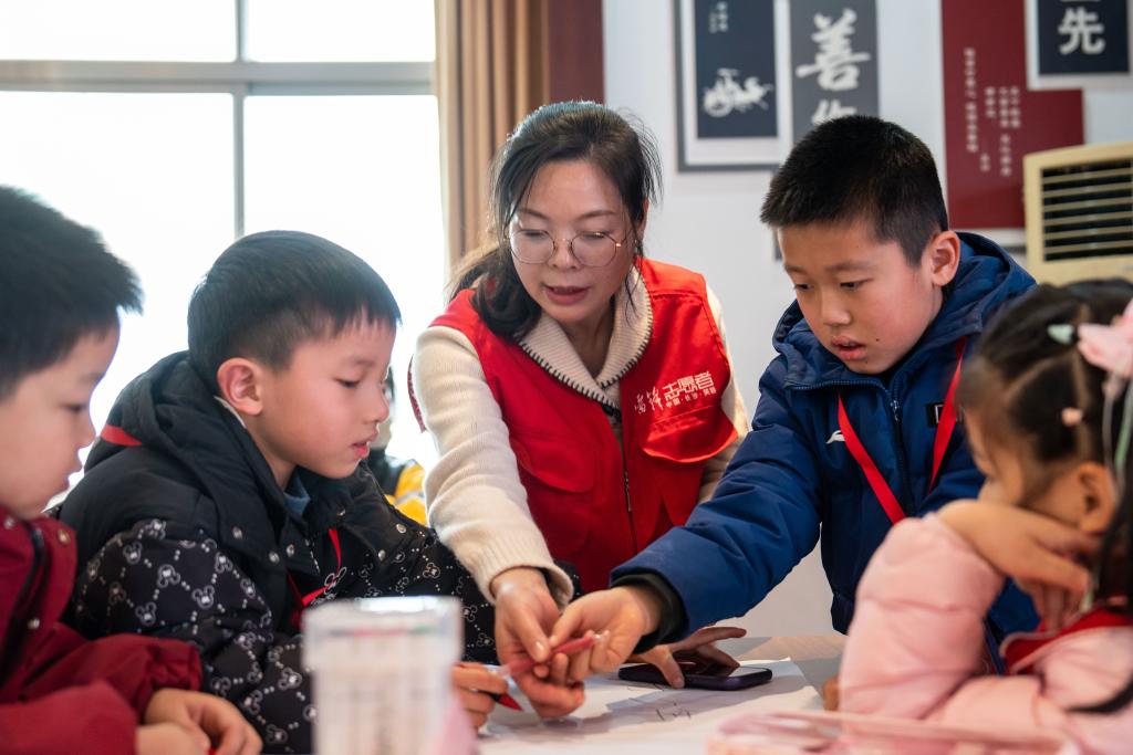 1日、芙蓉区識字里社区(コミュニティー)サービスセンターで児童の学習を指導するボランティア(中央)。(長沙=新華社記者/陳思汗)