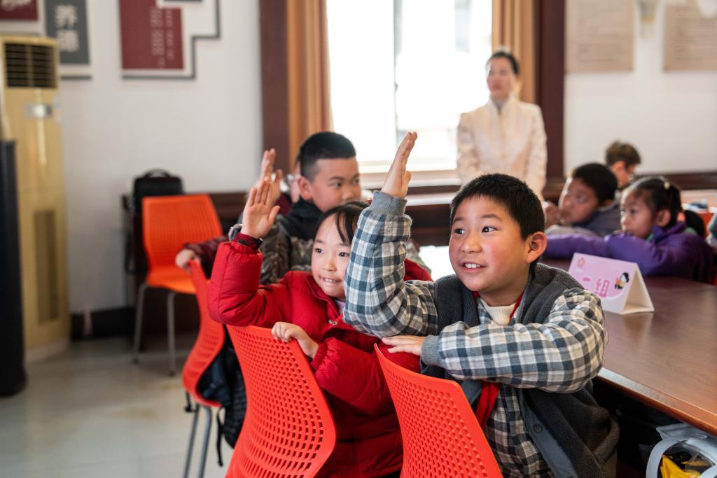 1日、芙蓉区識字里社区(コミュニティー)サービスセンターで手を挙げて問題に答える児童。 (長沙=新華社記者/陳思汗)