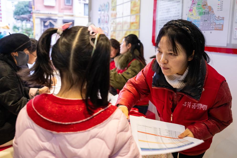 1日、学童支援の利用手続きを行うボランティア(右)。(長沙=新華社記者/陳思汗)