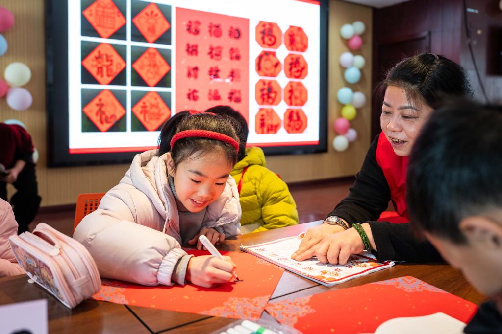 1日、芙蓉区識字里社区(コミュニティー)サービスセンターで「福」の字を書く児童。(長沙=新華社記者/陳思汗)