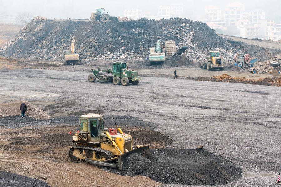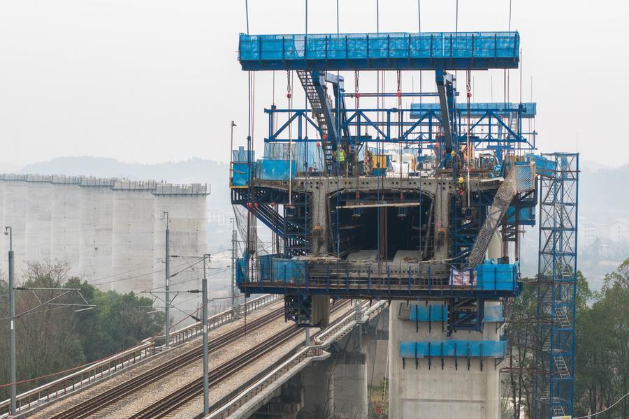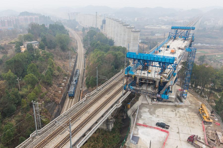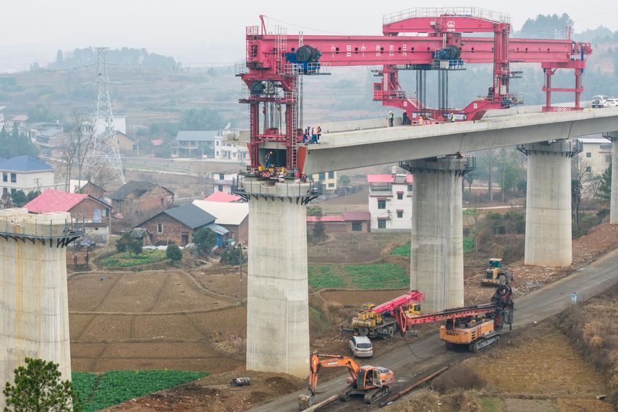【新華社長沙2月8日】春節(旧正月)を控え、中国湖南省の邵永高速鉄道(邵陽-永州)建設現場では作業員らが重要工程を順調に進めている。