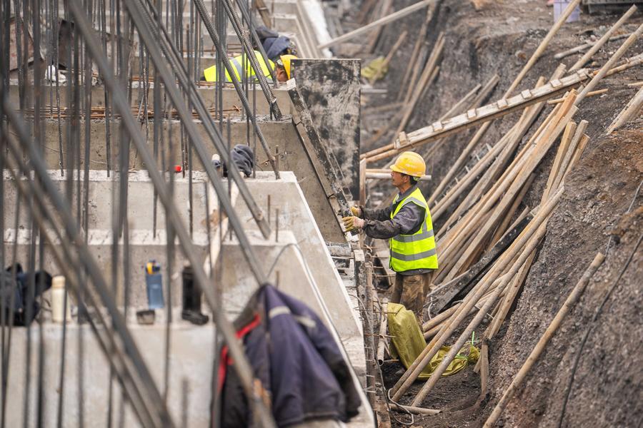 5日、邵永高速鉄道邵陽県駅の建設現場で働く作業員。(長沙=新華社記者/陳思汗)