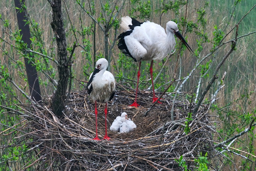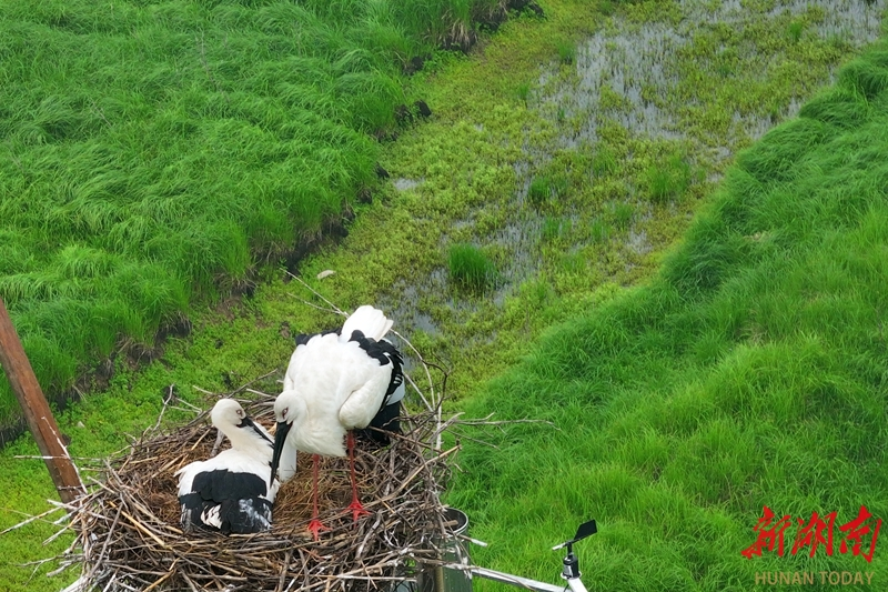 3月25日、湖南省南県の南洞庭湖の舵杆洲水域で、コウノトリが巣の中のヒナを見守っていた。「鳥のジャイアントパンダ」とも呼ばれるこの希少種は、当地で3年連続で定住・繁殖している。観測によると、個体数のピークは40羽を超えている。当地では立体的な巡視体制と体系的な生態ガバナンスをもとに、湿地環境を改善しつつ、長江大保護と人と自然の調和ある共生を推進している。