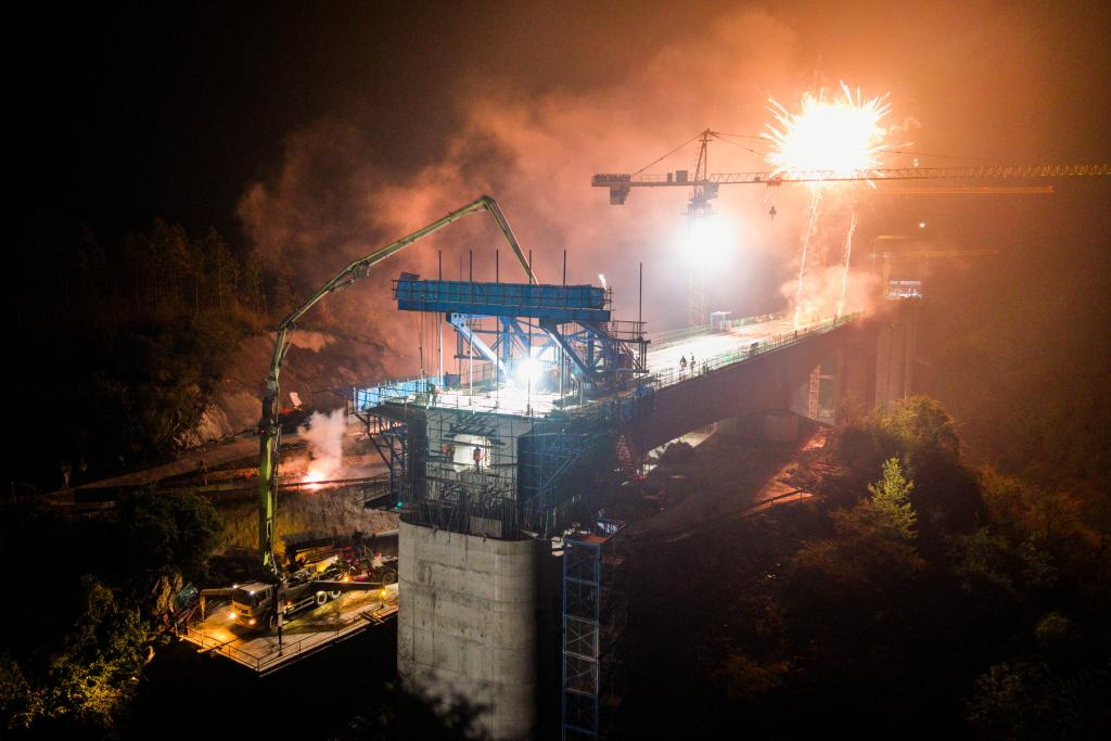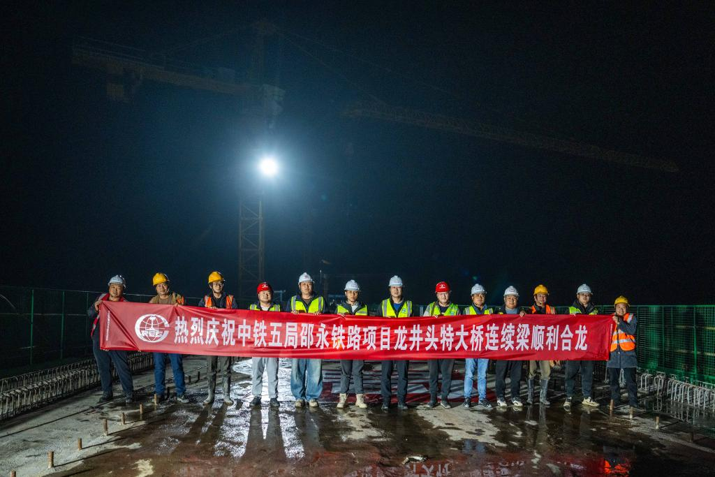 【新華社長沙4月1日】中国インフラ建設大手、中国中鉄傘下の中鉄五局集団が施工を請け負う邵永(湖南省邵陽市-永州市)高速鉄道の重要プロジェクト、竜井頭特大橋で3月26日、連続桁に最後のコンクリートが打設されて接合が完了した。これにより同高速鉄道の建設が大きく前進し、全線の橋桁架設工事に向けた基盤が整った。