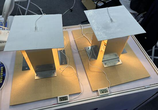 会場で、断熱材を使用した板材と、普通の板材を比べると、断熱効果には10度以上の差があった。