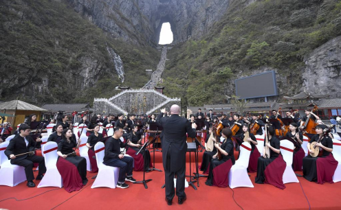 4月12日、湖南省張家界市天門洞の麓でコンサートが上演された。湖南省民族楽団と張家界フィルハーモニー管弦楽団の芸術家らが定番曲を演奏し、多くの観光客が足を止めて耳を傾け、中国民楽の魅力を身近に感じていた。最近、張家界の各観光地は良質なイベントを続々と打ち出し、観光の「盛り上がり」を後押ししている。向韬 撮影