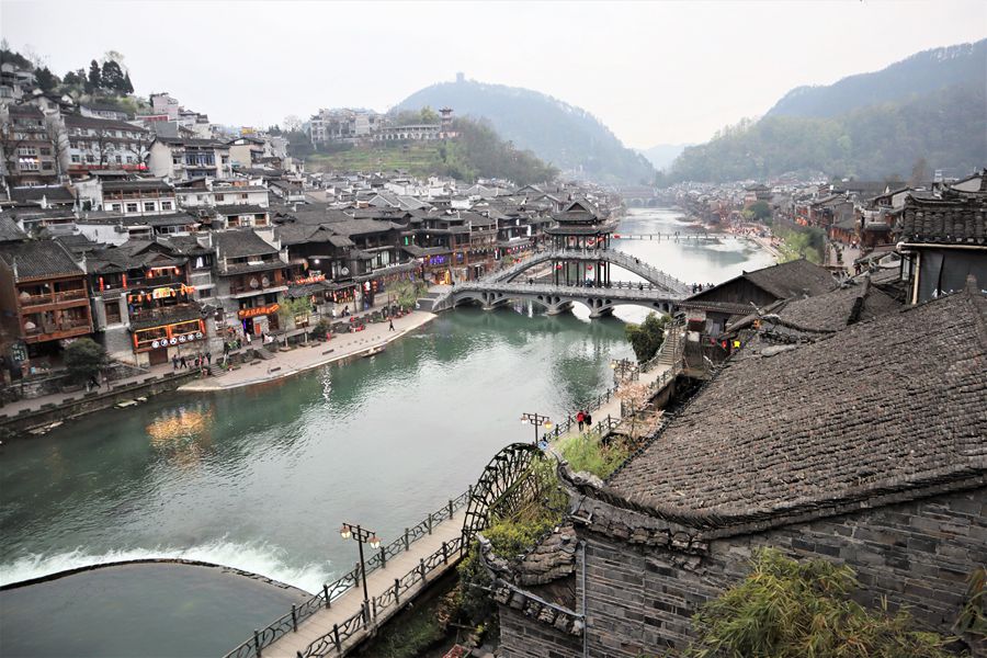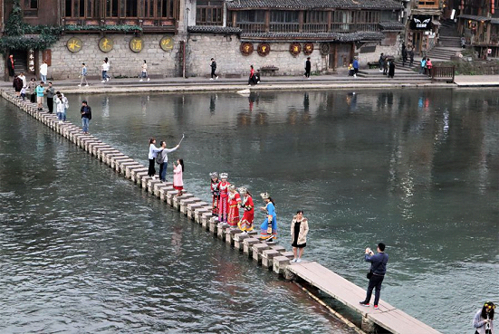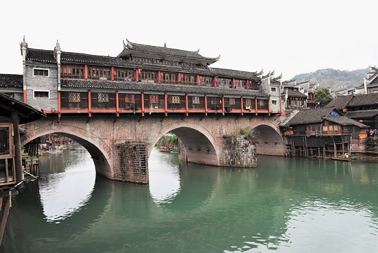 著名な文豪や画家を輩出し、人と古城文化が混然一体となった湘西民族の風情が残る古城です。街の真ん中を長江の支流、沱江(トゥオジャン)が流れ、両岸を結ぶ飛び石と古代の趣ある虹橋は鳳凰を象徴する風景です。沱江の河岸には木造の古建築の建物が並び細い路地から沱江に面した古い建物に入ると地下への階段がついています。昔は地下から直接河に出て舟を利用していたのでしょうか。また木造建物と石を積み上げた石造りの建築が調和しているのもこの古城を歩く楽しさです。沱江には“沱江四橋”と呼ばれる趣のある「風橋」「雨橋」「雪橋」「霧橋」がかかっています。橋の上には木製で屋根のある趣のある回廊風の建物があり、その橋を渡り古の文化に浸るのも鳳凰の楽しみ方の一つです。