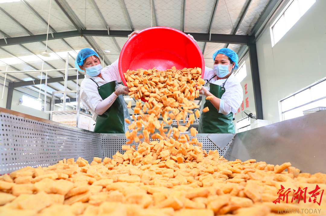 4月17日、新田県石羊鎮三水村の生産現場で、作業員が「新田酢水豆腐」を作っていた。近年、同県は土地とセレンが豊富な資源の優位性を利用し、「会社+基地+農家」の形式で国家地理的表示製品「新田大豆」産業を発展させ、「新田大豆」で生産された各種大豆製品は長沙と広東・香港・マカオ地区でよく売れている。 記事出処:新湖南