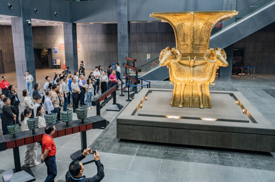 近日、寧郷市炭河里青銅博物館で、観光客が国宝級の文物「四羊方尊」(複製品)を鑑賞していた。同館は湖南省唯一の青銅文化をテーマとした専門館で、様々な文物を総計5651点収蔵し、商・周時代の寧郷地域の輝かしい...