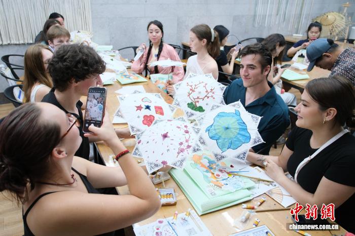 2025年6月、浙江省杭州市の中国刀剪剣博物館で、自分でデザインした傘布を手に写真を撮影する外国人たち(撮影・曹丹)。