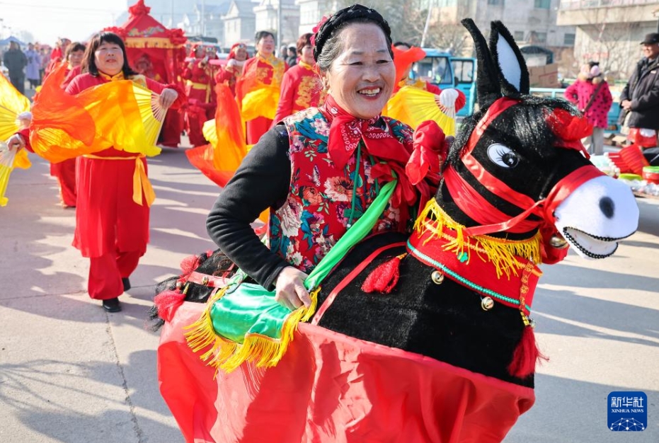 江蘇省連雲港市贛楡区墩尚鎮郷村のマーケットで、ロバの人形を使ったパフォーマンスを披露するパフォーマー(2月2日撮影・王健民)。